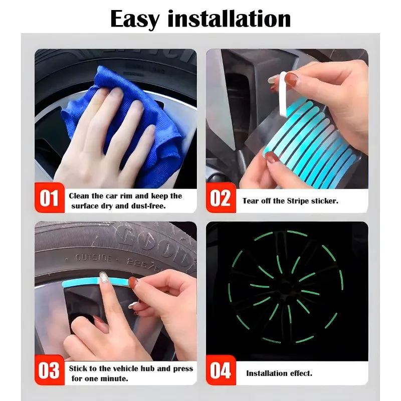 Ease of Installation: Installation is simple. You only need to clean the surface to keep it dry, take out the car stickers, tear off the cute stickers, stick on the car wheel, and press for a while to ensure that there is no air inside, it is recommended not to wash the car within 24 hours.