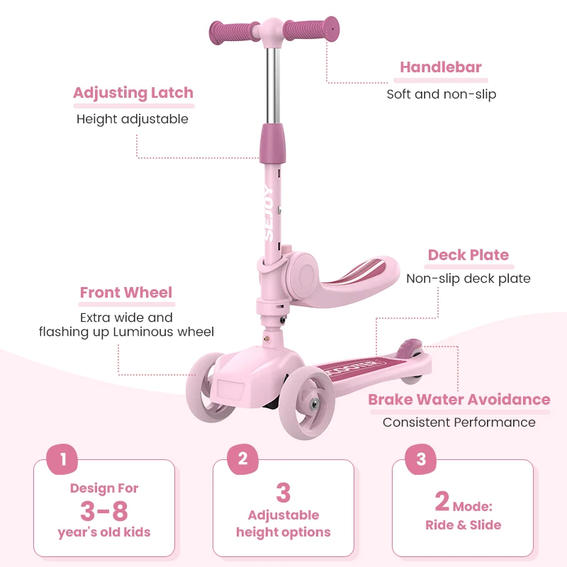 SIT-OR-STAND DESIGN: Our toddler scooter features a removable flip-out seat with a 45lb capacity, offering comfortable cruising options. It ensures a smooth transition as they grow, easily detachable for confident standing.